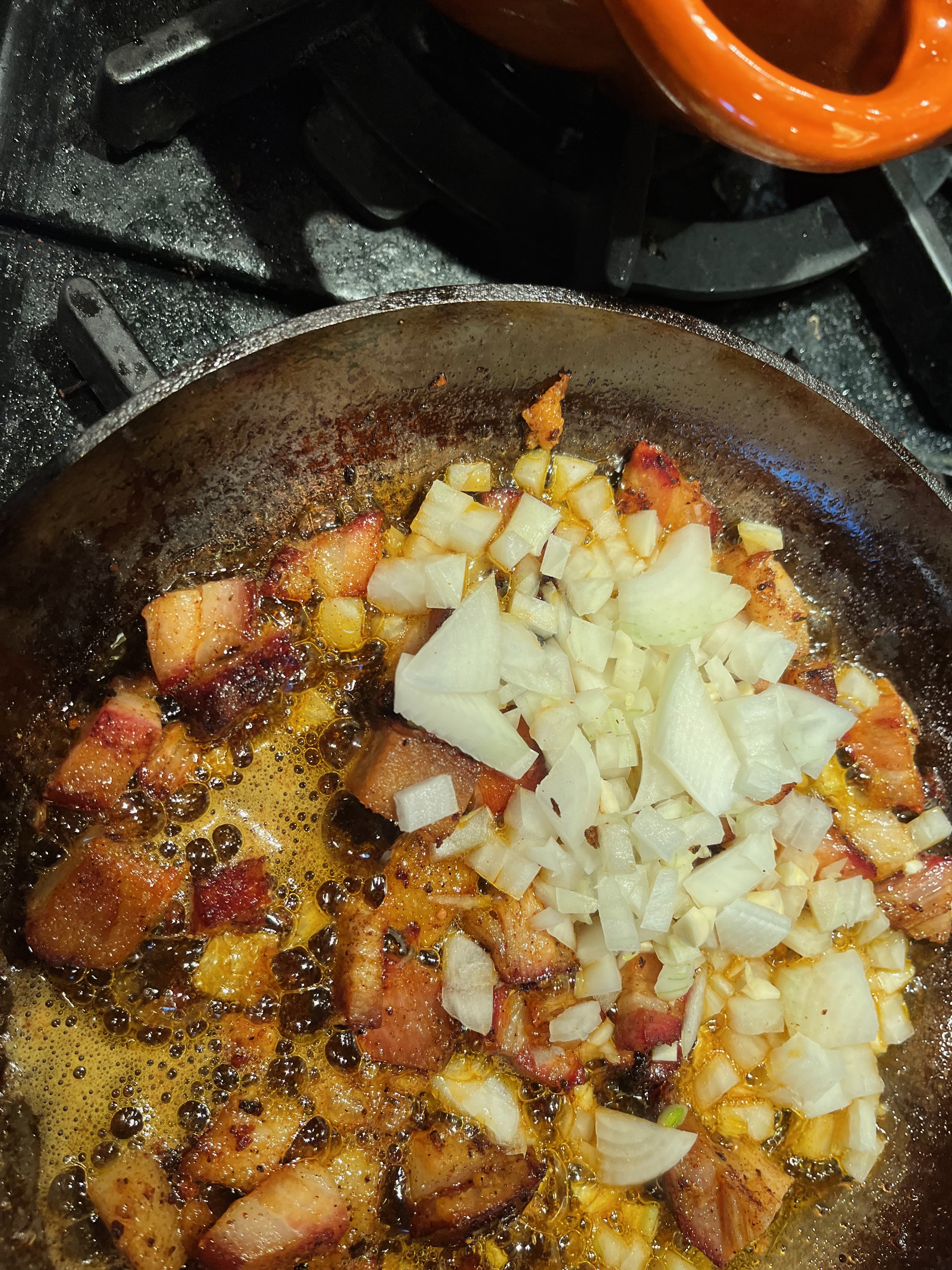 Add the pork belly and onion mixture to the pot with the beans and stand back--and remember to wear an apron--this may sizzle and pop.