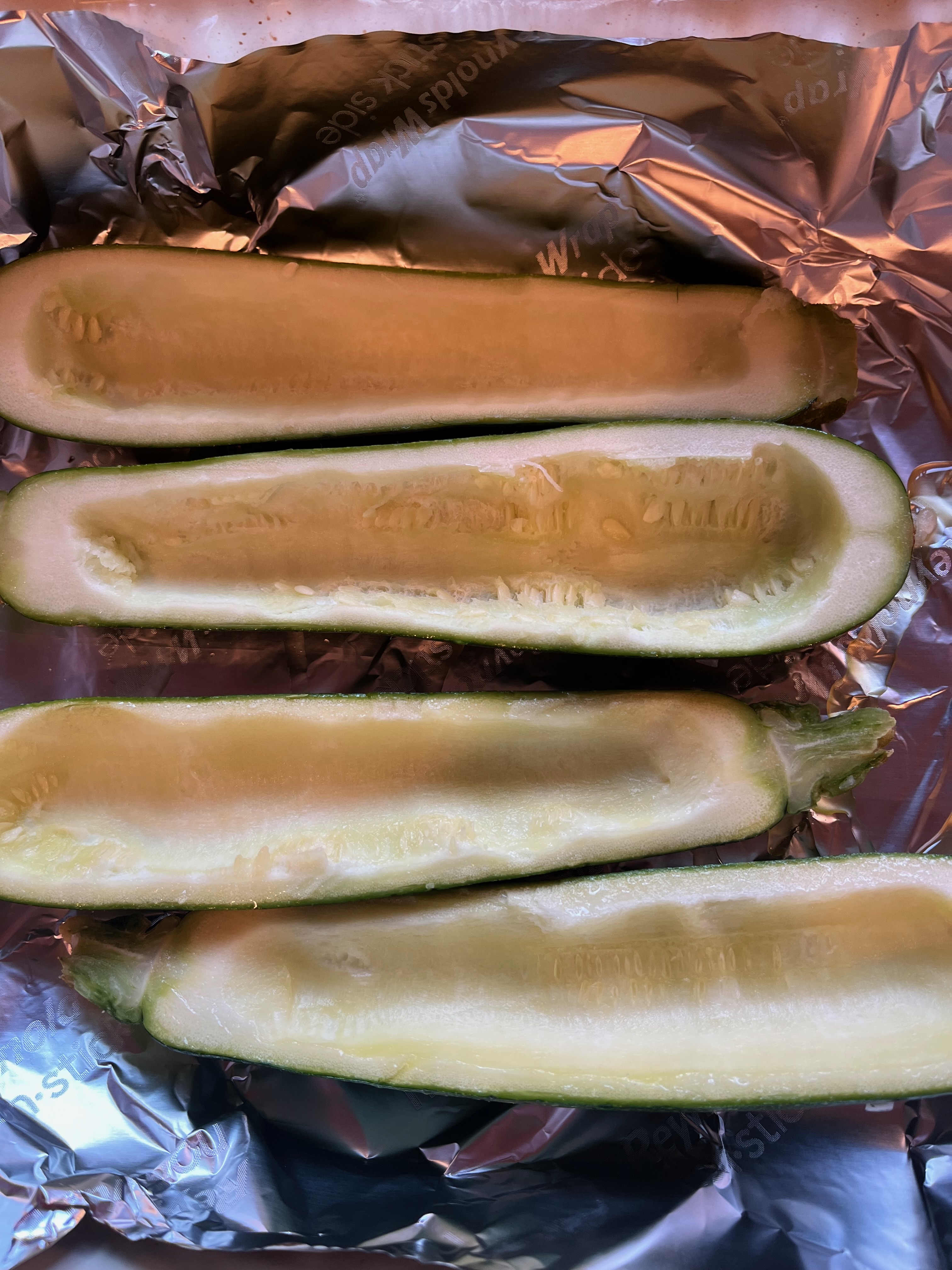 Wash the zucchinis and slice them in half. Using a spoon, scrape out the seeds in the middle of the zucchini, leaving a 1/3" (or so) wall.