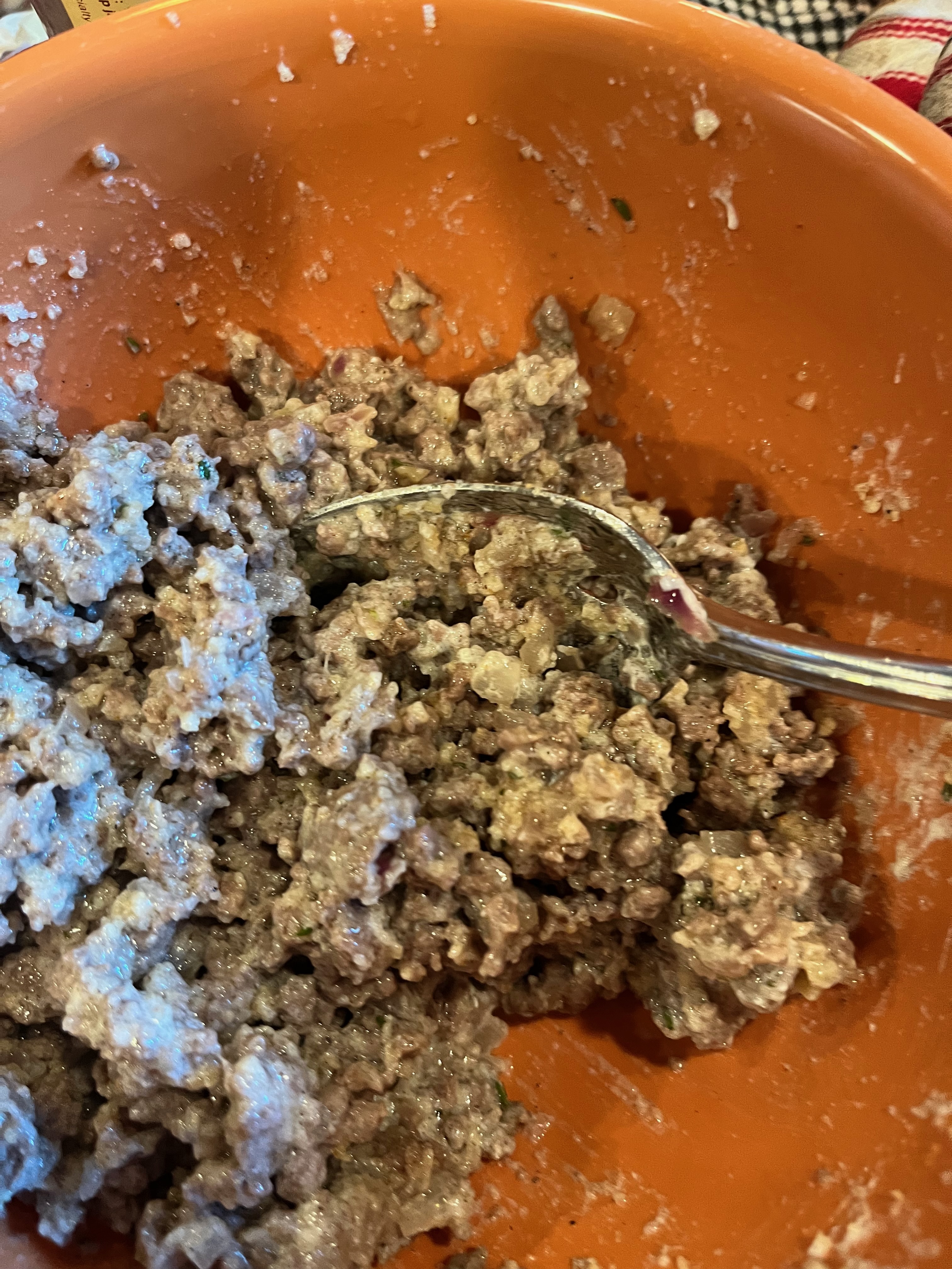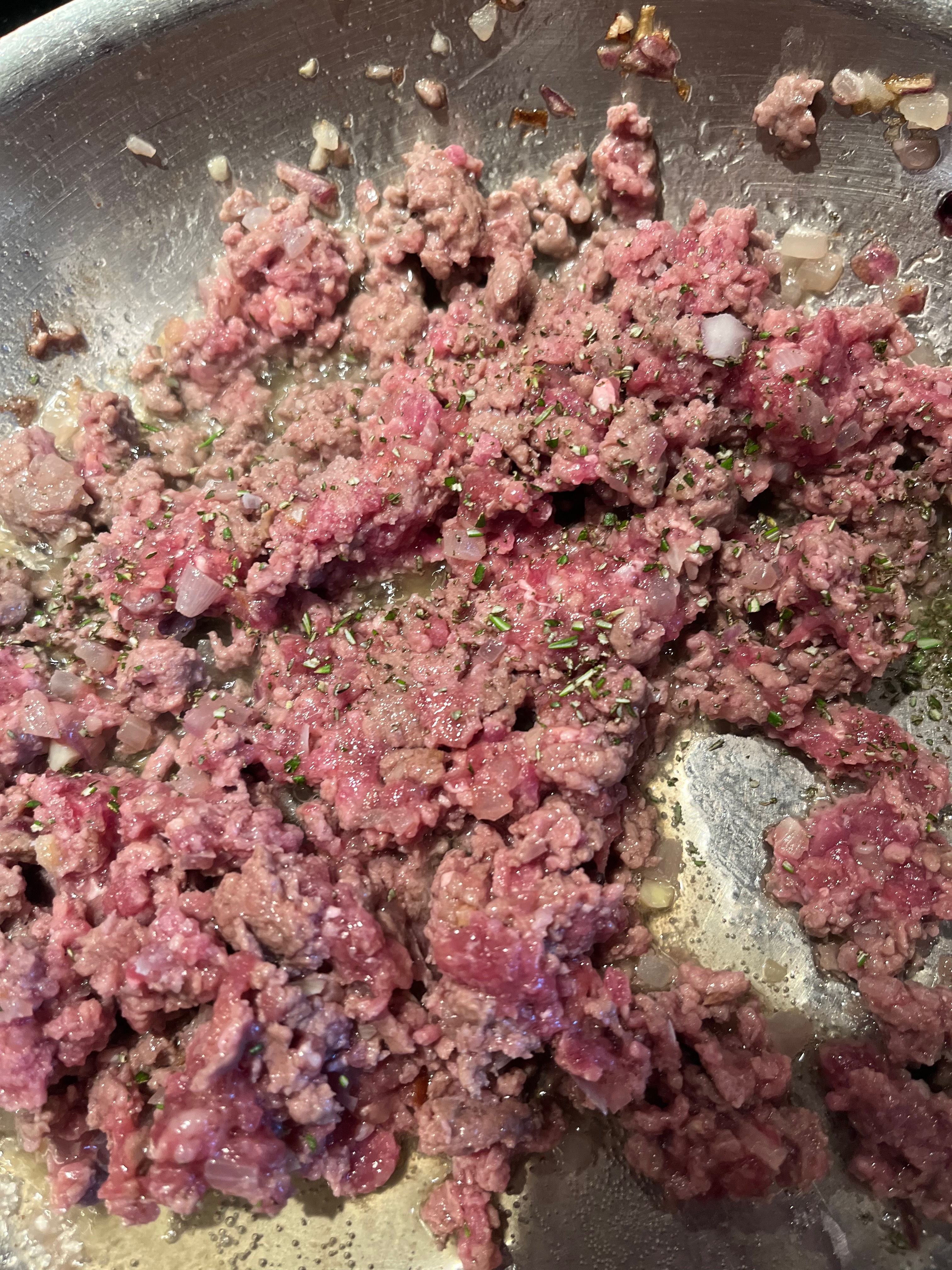 Using a slotted spoon, remove the meat mixture to a bowl. Stir in the allspice, rosemary, salt, pepper, bread crumbs, red pepper flakes and tomato paste. Stir well to incorporate.