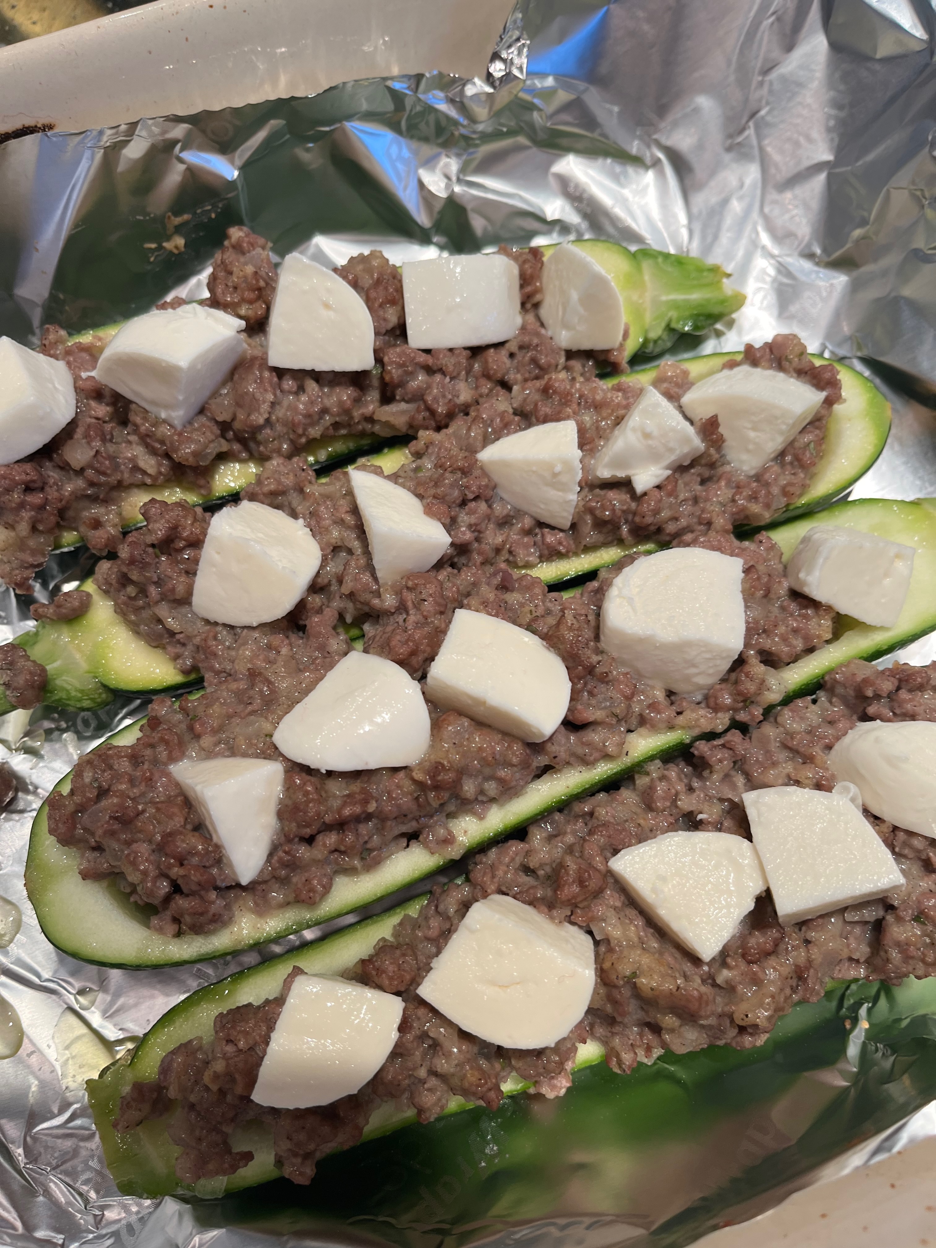Pour beaten egg over top of mixture and mix well. Line a cookie sheet with non-stick aluminum foil and place hollowed-out zucchinis on top of foil. Stuff zucchini halves each with 1/4 of the meat mixture. Place in oven and cook for about 20 minutes.