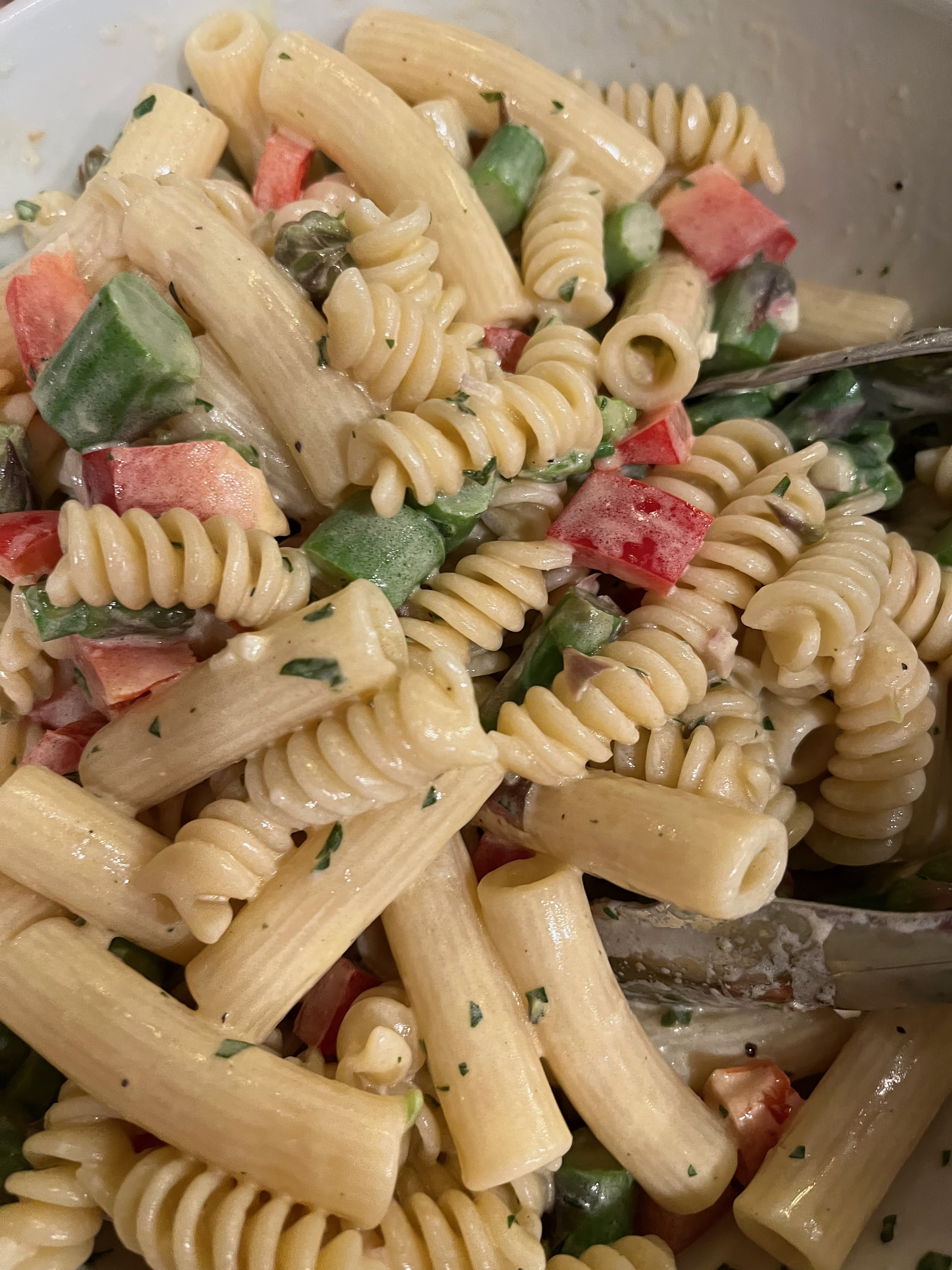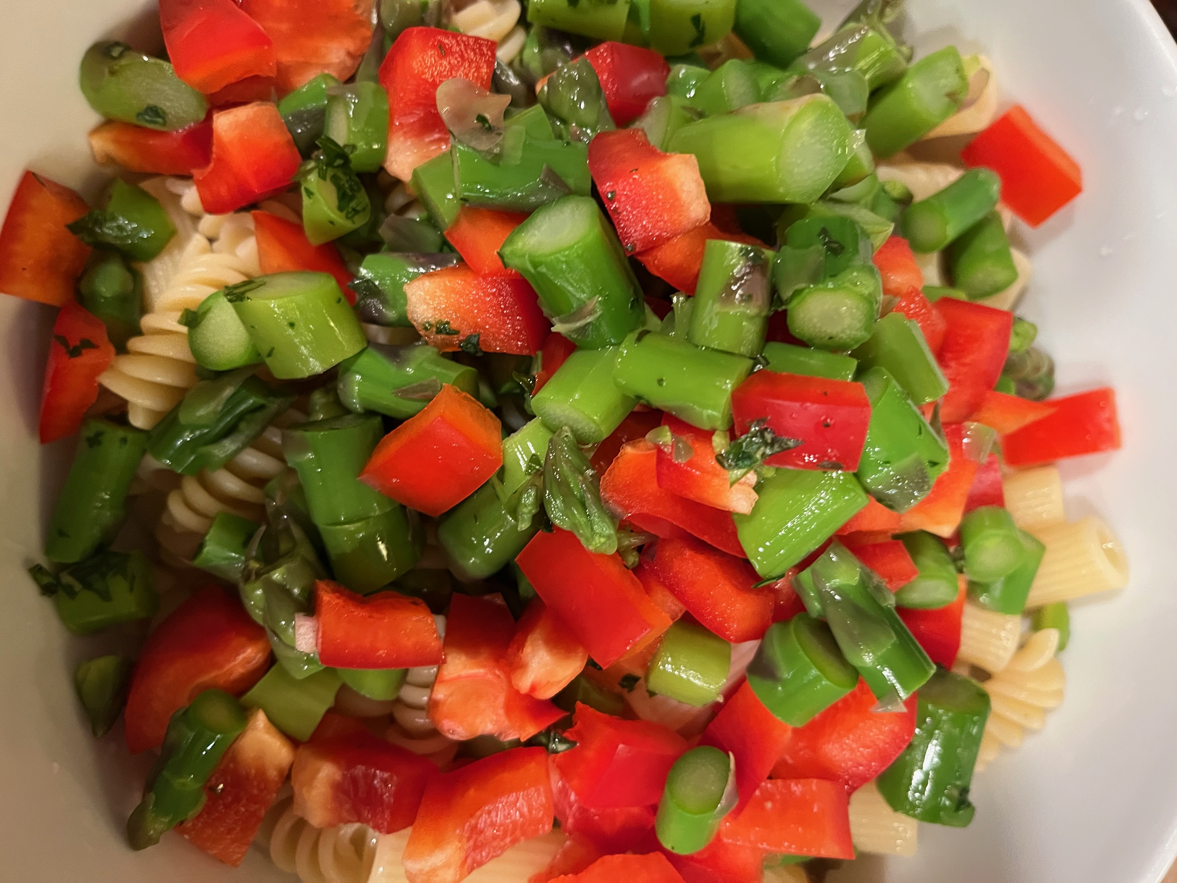 In a large bowl, add cooked pasta, cooked and sliced asparagus and diced red bell pepper. Toss well with one recipe of mayonnaise vinaigrette. Taste for salt and pepper and adjust if necessary.