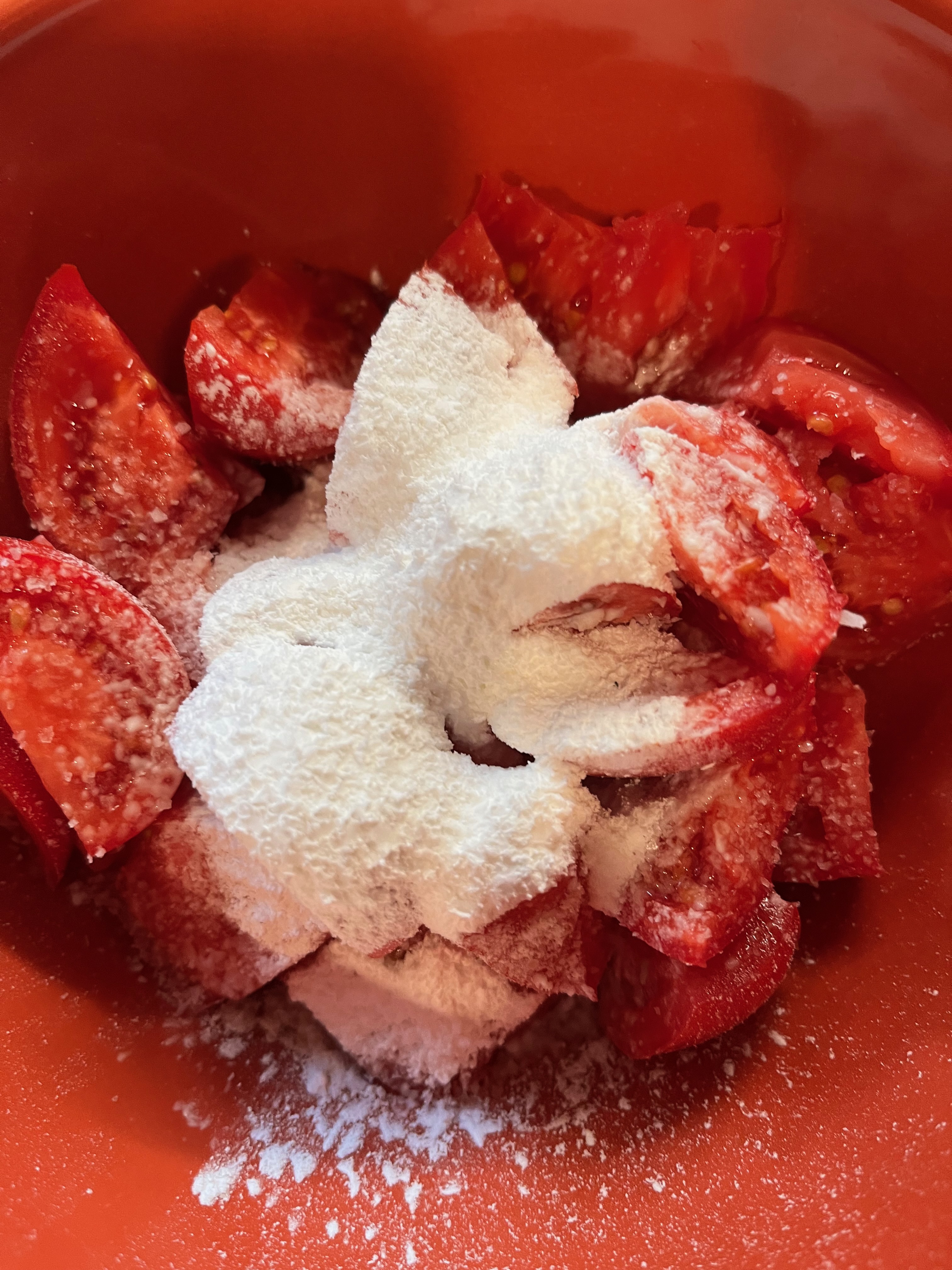 In a separate bowl, mix the sliced tomatoes with the corn starch and pinch of salt and pepper.