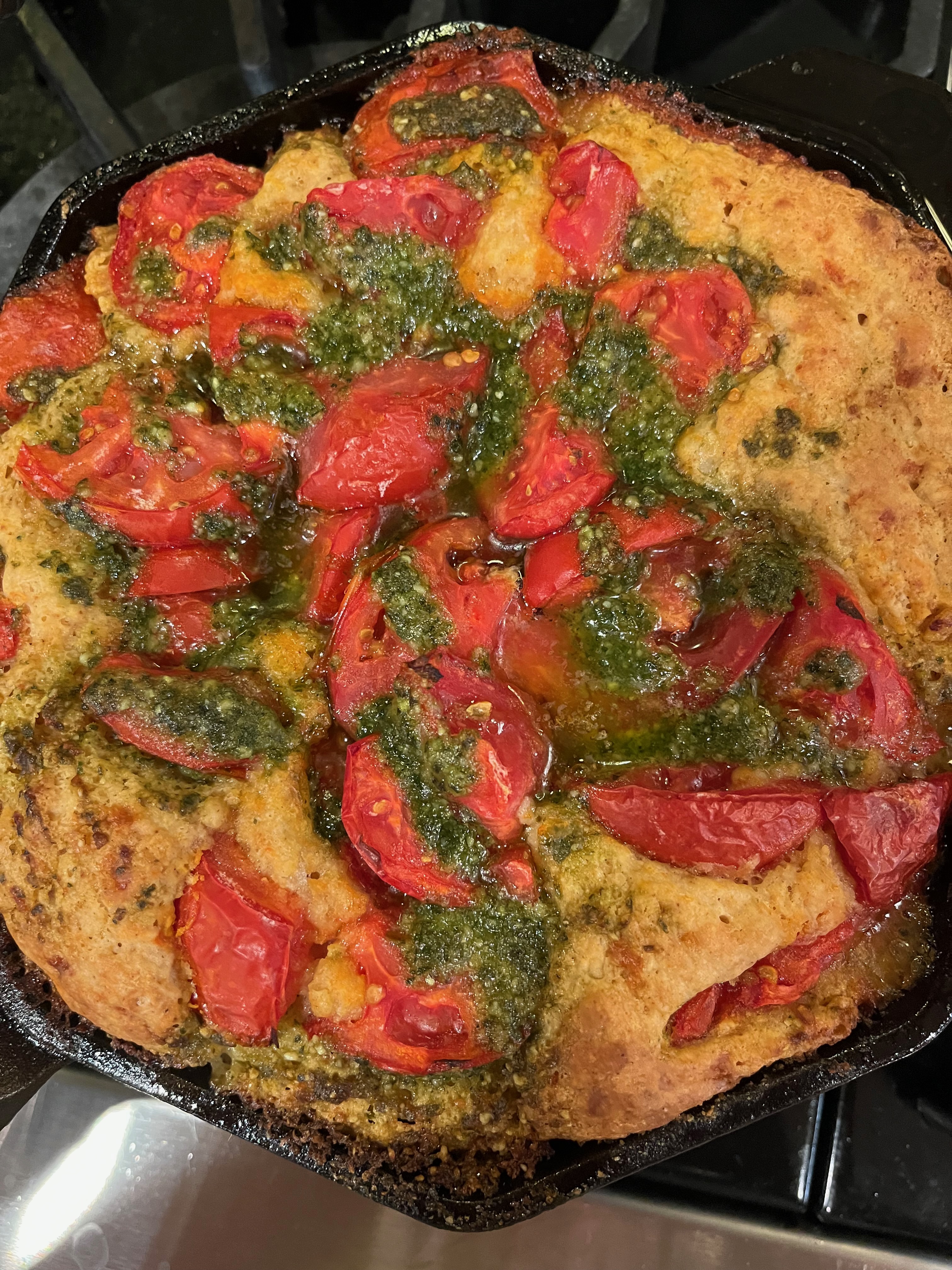 Add the tomato mixture on top of the wet mixture in the skillet and drizzle with more pesto. Place in oven and set a timer to check it after about 30 minutes. My cobbler took almost an hour to set up, but continue to check it for doneness.